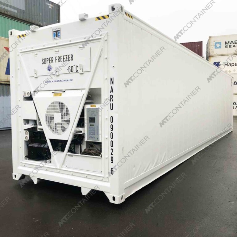 Ein grauer 40 Fuss High Cube Seecontainer mit der Aufschrift NARU 527544-2 steht auf festem Untergrund. Die Tür hat mehrere Verschlüsse und Aufkleber.