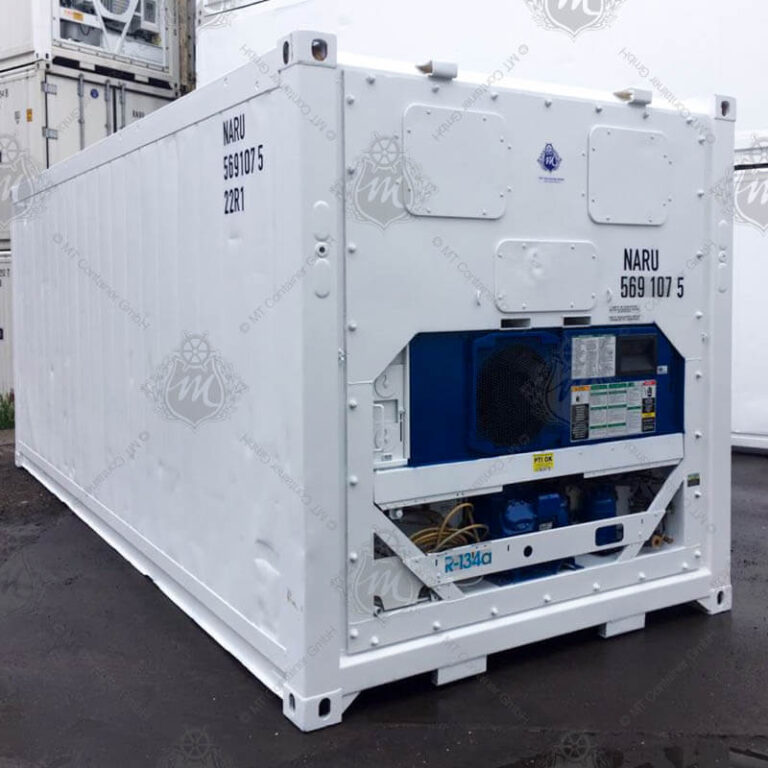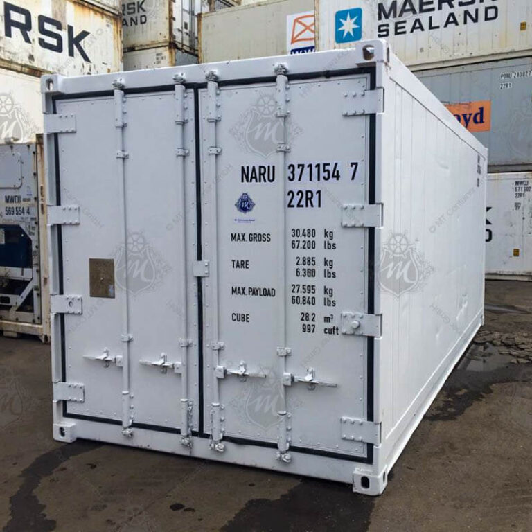 Weißer Kühlcontainer 40 Fuß High Cube mit Doppeltür Außenansicht